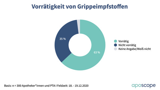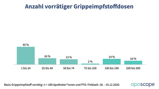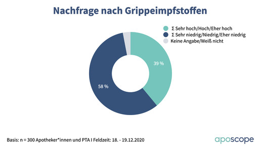 Bei einer aposcope-Umfrage gab nur noch jeder fünfte Teilnehmer an, dass die Nachfrage nach Grippeimpfstoff derzeit „sehr hoch“ oder „hoch“ ist (21 Prozent). „Eher hoch“ finden weitere 18 Prozent die Nachfrage. Auf der anderen Seite gab entsprechend eine Mehrheit von 58 Prozent an, dass es kaum noch Bedarf gibt: 24 Prozent sehen eine „eher niedrige“ Nachfrage, 14 Prozent eine „niedrige“ und 21 Prozent eine „sehr niedrige“ Nachfrage.