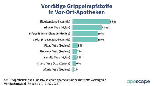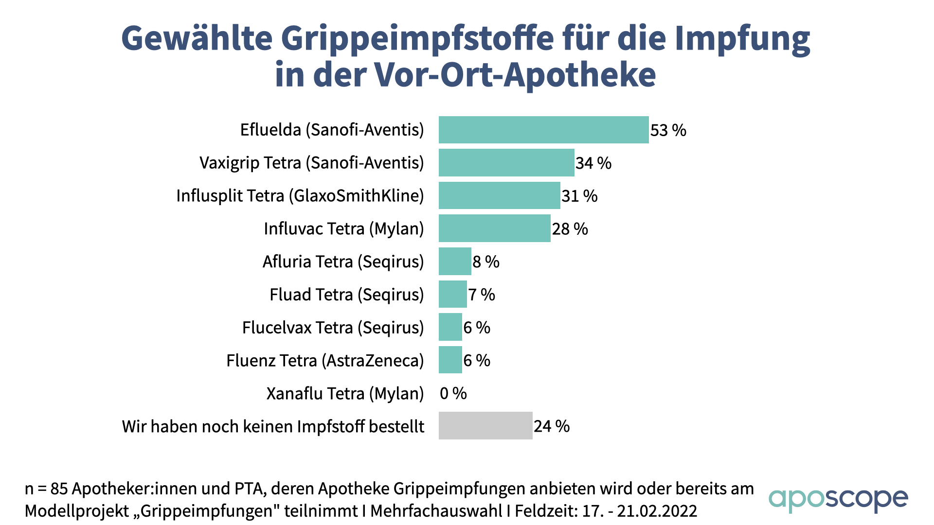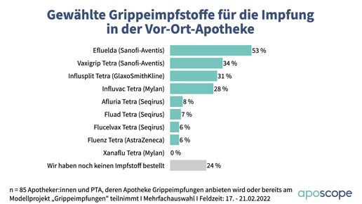 Und dann sind da ja noch die Apotheken selbst, die ebenfalls im Rahmen von Modellprojekten Grippeimpfungen anbieten können. 12 Prozent der Befragten geben an, dass in ihrer Apotheke geimpft wird, 29 Prozent wollen künftig einsteigen und die Mehrheit (59 Prozent) möchte nicht impfen. Welche Impfstoffe bestellen die impfenden Kolleg:innen für den Bedarf der Apotheke? Auch hier liegt Efluelda (53 Prozent) vorn. Gefolgt von Vaxigrip Tetra (34 Prozent), Influsplit Tetra (31 Prozent) und Influvac Tetra (28 Prozent).