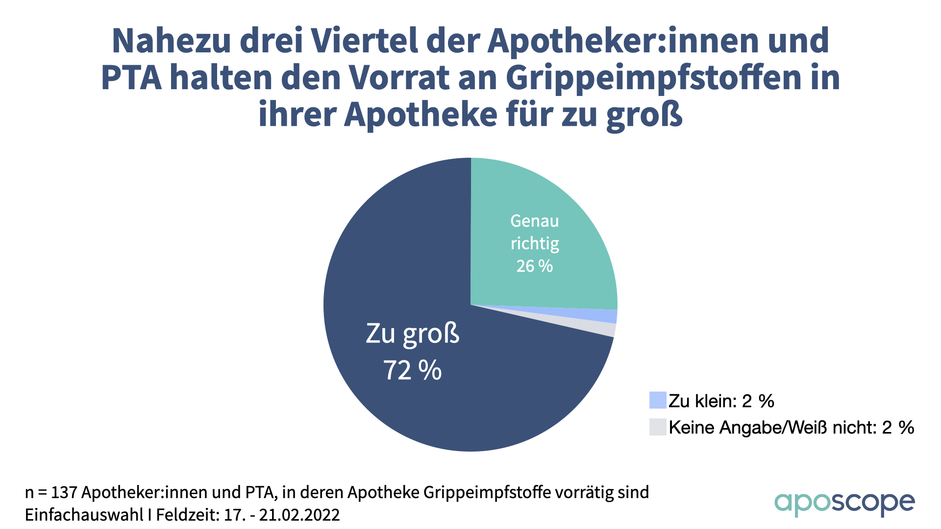 72 Prozent dieser Befragten fürchten, dass ihr Vorrat zu groß für die restliche Influenzasaison ist, während 26 Prozent hoffen, dass ihre Bestände genau richtig sind. Der Großteil betrifft Einzelpackungen (84 Prozent), 57 Prozent der Befragten haben noch Packungen zu zehn Impfdosen vorrätig und der Anteil an Packungen zu 20 Dosen liegt bei 12 Prozent. Über alle Packungen hinweg sind im Durchschnitt rund 60 Dosen in den betroffenen Apotheken vorrätig.