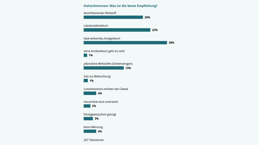 Ein lokal wirkendes Analgetikum sei die beste Empfehlung, gaben 28 Prozent der Teilnehmer an. 22 Prozent würden ein Produkt mit Lokalanästhetikum abgeben, weitere 20 Prozent finden einen desinfizierenden Wirkstoff wichtig. Allerdings: Dass ein Antibiotikum unerlässlich sei, gab nur 1 Prozent der Teilnehmer an.