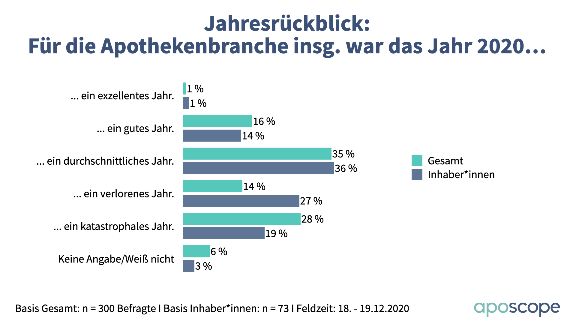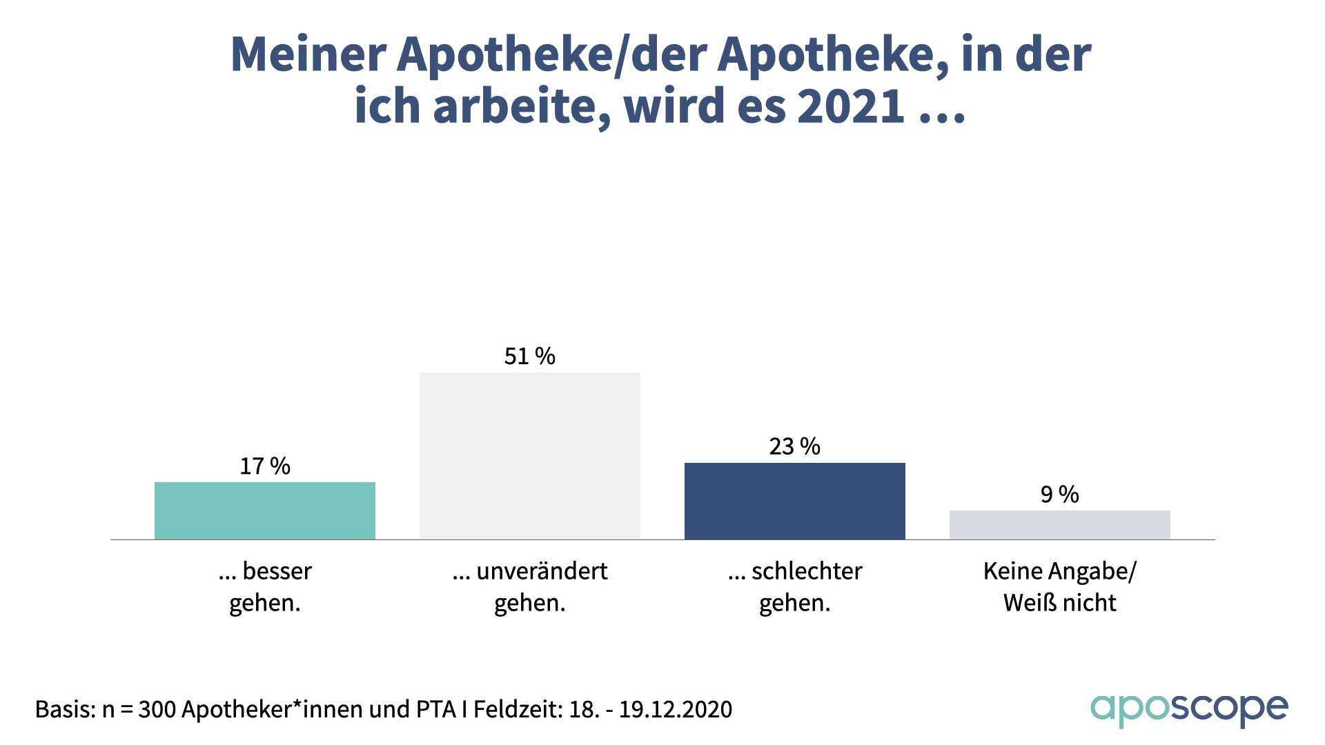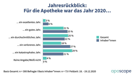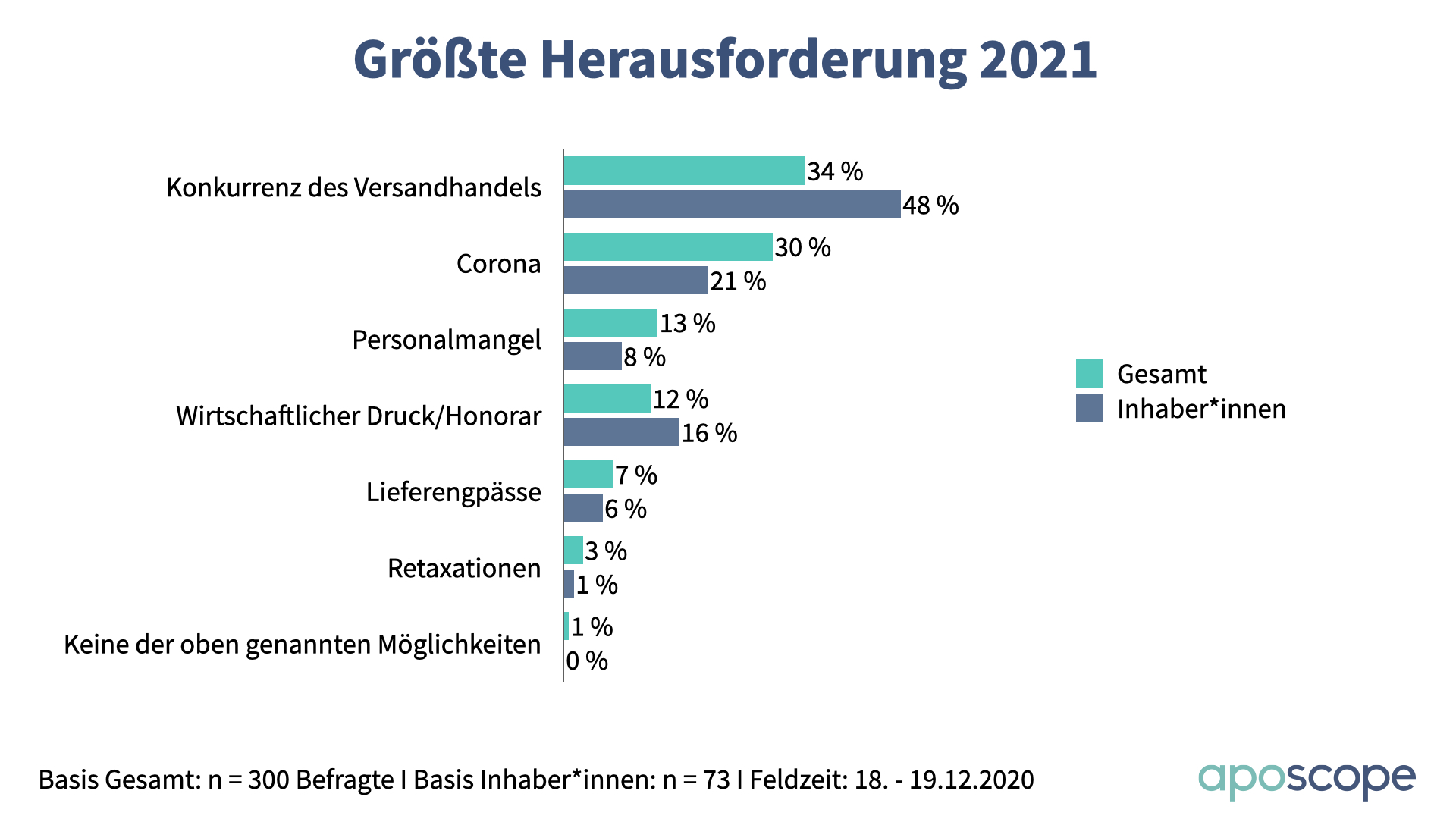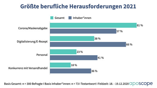 2020 war auch in den Apotheken geprägt von der Corona-Pandemie. Wie hat sich das auf den Betrieb ausgewirkt? Wer sind die Gewinner und Verlierer der Krise. Und was erwarten die Teams vom neuen Jahr? In der großen aposcope-Befragung zum Jahreswechsel überwiegt in der Offizin die Skepsis. Personalsorgen, wachsende Lieferengpässe und ein durch das E-Rezept gestärkter Versandhandel sind die größten Sorgen der Inhaber.
