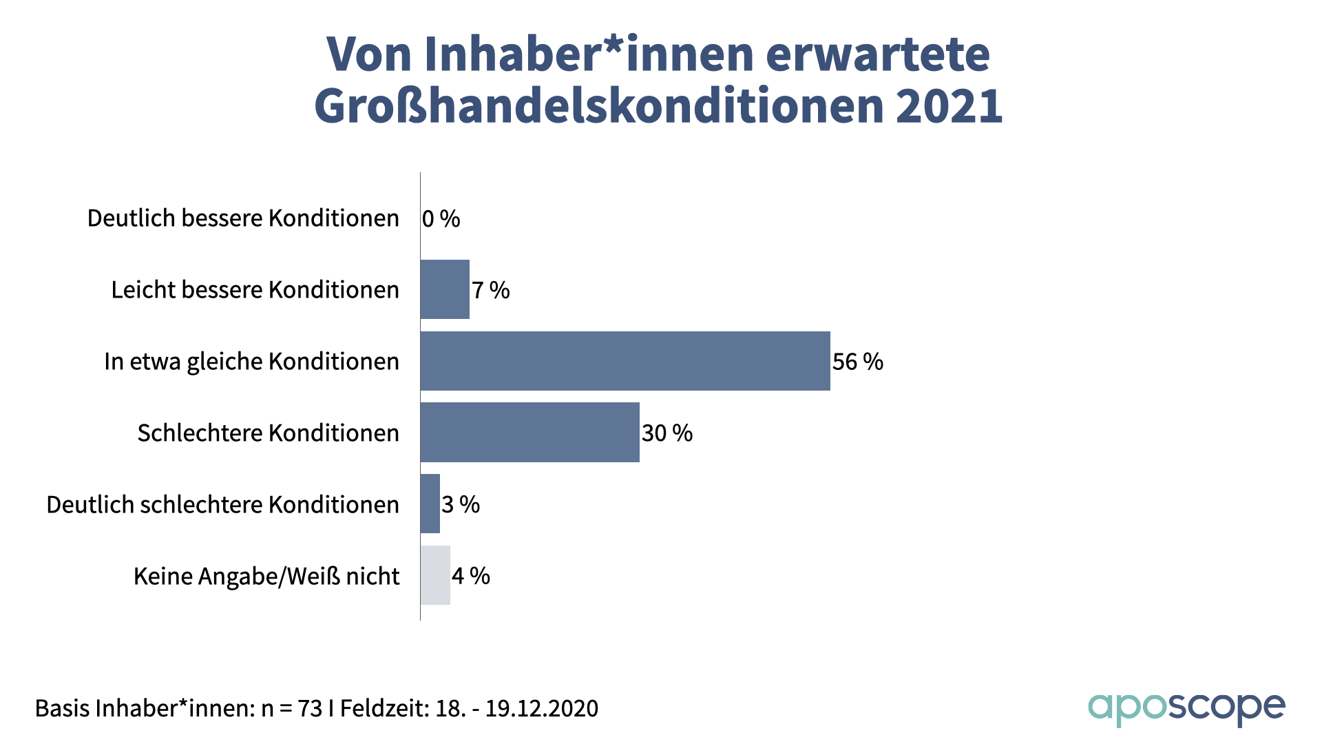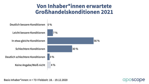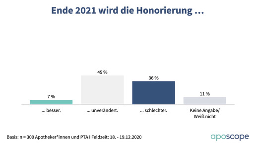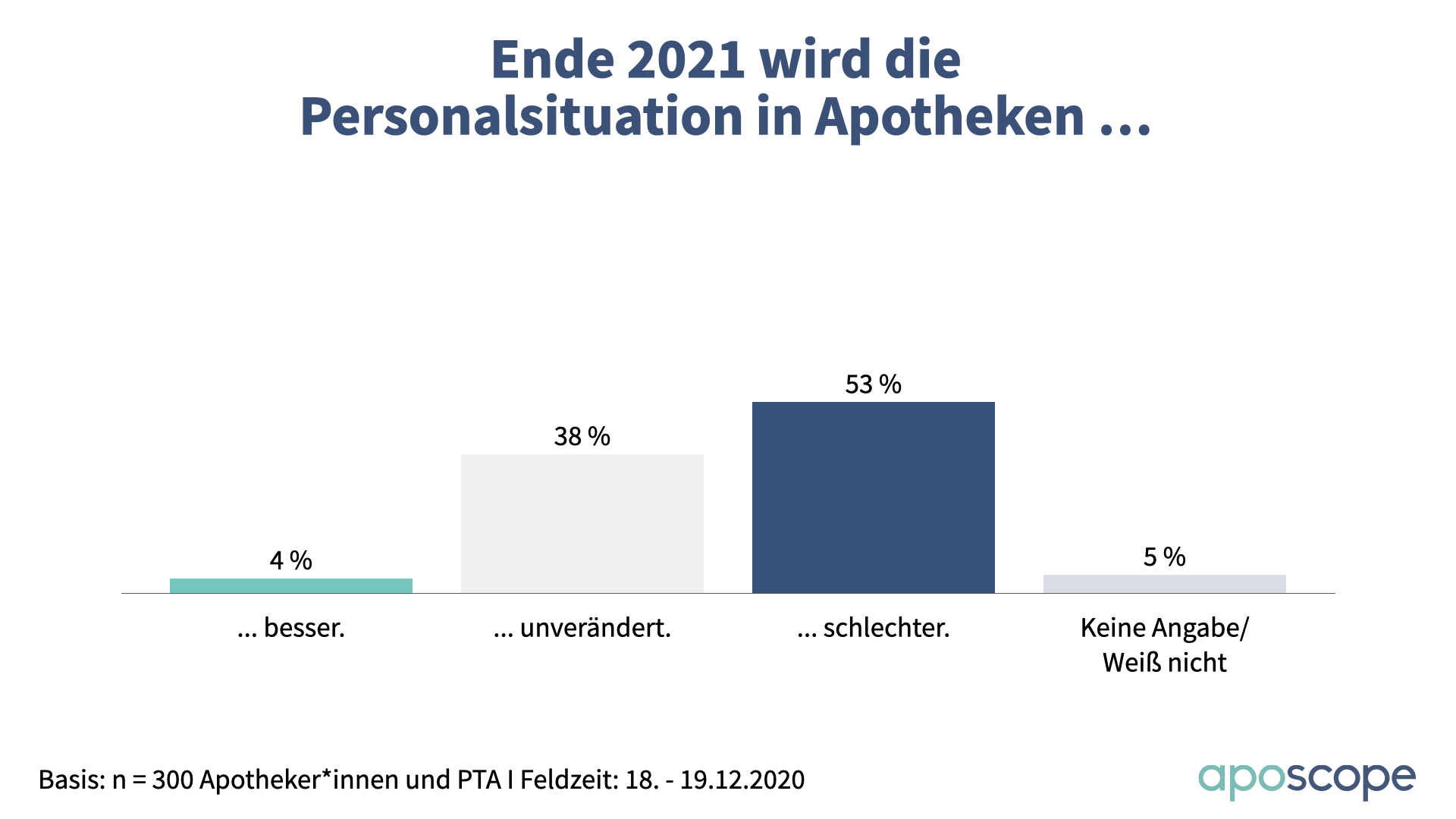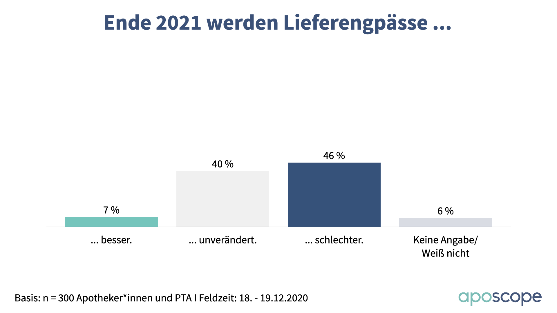 Und was drückt die Stimmung? 53 Prozent der Befragten gehen davon aus, dass sich die Personalsituation in den Apotheken 2021 verschlechtern wird. Auch das Dauerproblem der Lieferengpässe wird laut 46 Prozent noch größer, weitere 40 Prozent erwarten eine gleichbleibend schwierige Situation. Und auch beim Honorar besteht wenig Hoffnung: Nur 7 Prozent rechnen hier mit einer Verbesserung.