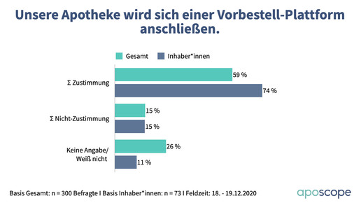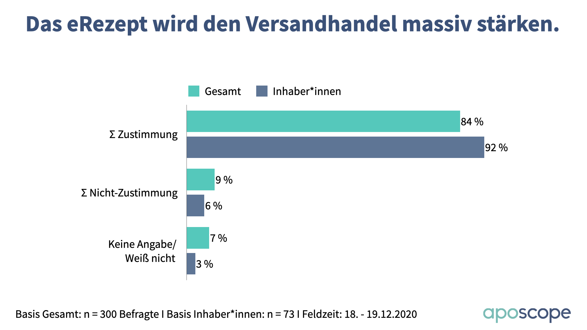 Die Einführung des E-Rezepts wird das kommende Jahr fraglos prägen. Doch mit einer flächendeckenden Einführung rechnet nur jeder Dritte (34 Prozent). Ab 2022 soll das E-Rezept allerdings verpflichtend sein. Worin sich die große Mehrheit einig ist: 84 Prozent denken, dass das E-Rezept den Versandhandel massiv stärken wird, unter den Inhabern sind es sogar 92 Prozent. Als Gegenmittel werden gemeinhin die Apothekenplattformen gesehen. 59 Prozent (74 Prozent der Inhaber) gaben an, dass sich ihre Apotheke einer Plattform anschließen wird.