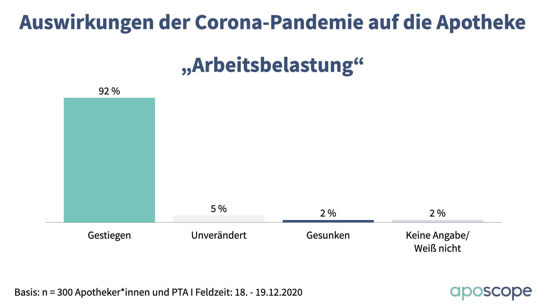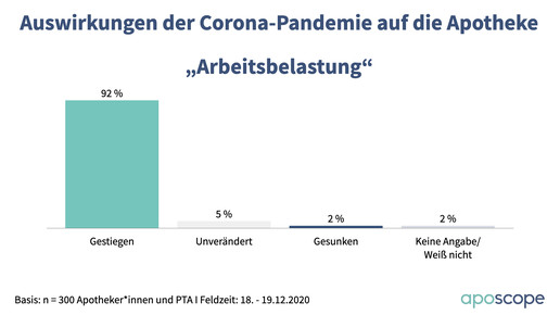 Immerhin: 65 Prozent der Befragten finden, dass die Apotheken in der Corona-Krise an Bedeutung gewonnen haben – neben politischem Schulterklopfen gab es mit dem Botendiensthonorar und der Vergütung für das Verteilen der Masken auch monetäre Anerkennung. Dafür haben die Teams in der Offizin aber auch hart gearbeitet: Stress (93 Prozent) und Arbeitsbelastung (92 Prozent) sind laut Aussage der Apotheker und PTA während der Pandemie gestiegen.