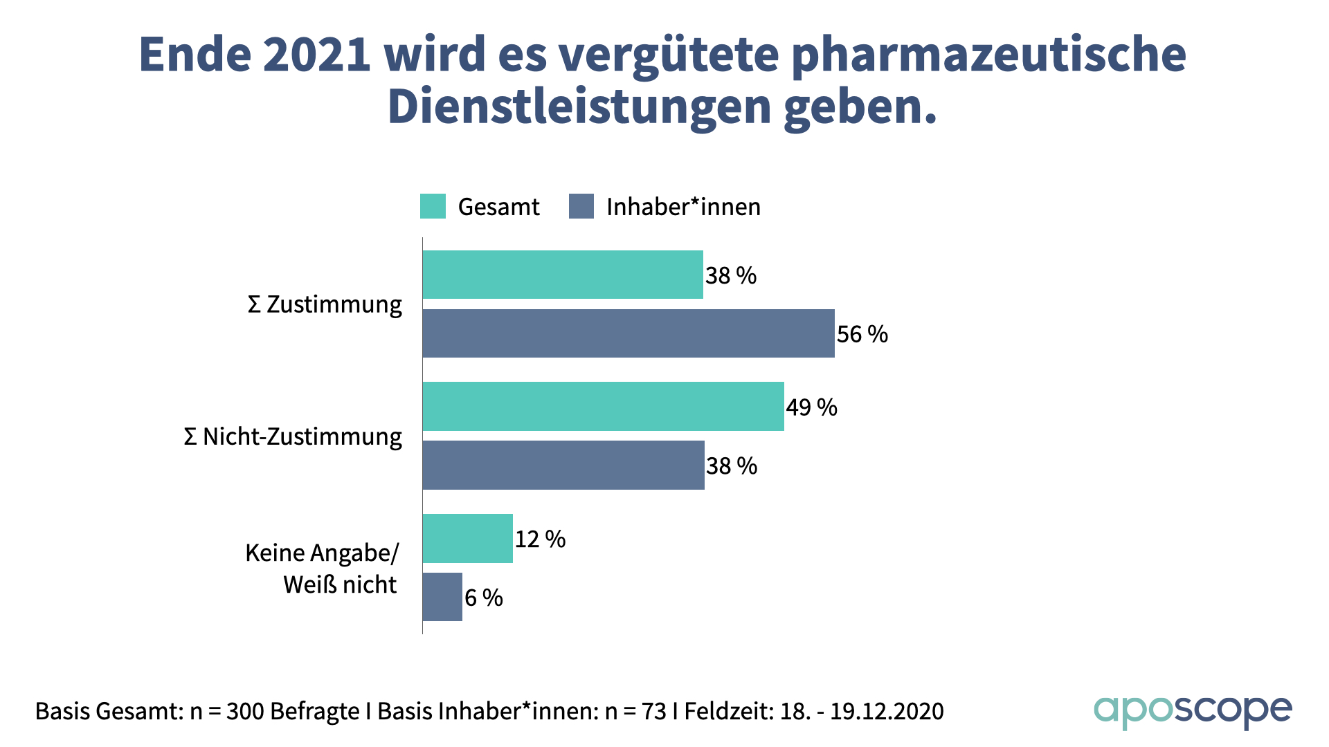 Dabei soll 2021 zumindest die Vergütung für pharmazeutische Dienstleistungen eingeführt werden. Nach Inkrafttreten des Apotheken-Stärkungsgesetzes (VOASG) müssen der Deutsche Apothekerverband (DAV) und der GKV-Spitzenverband allerdings die Details noch aushandeln. Daher hat die Hälfte der Befragten (49 Prozent) noch Zweifel, dass das 2021 gelingen wird.