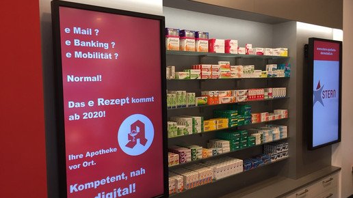 Daraufhin setzte er sich an den Computer und erstellte ein Werbeplakat, das bald in seiner digitalen Sichtwahl integriert werden soll. Es zeigt ein Sprungbecken in einem Schwimmbad. Darüber steht: „An heißen Tagen gehen Sie zum Abkühlen ins … oder in Ihre Apotheke vor Ort. Nur die Apotheke vor Ort gewährleistet eine Lagerung der Arzneimittel bei Temperaturen unter 25 °C.“ So werde Qualität gemacht!