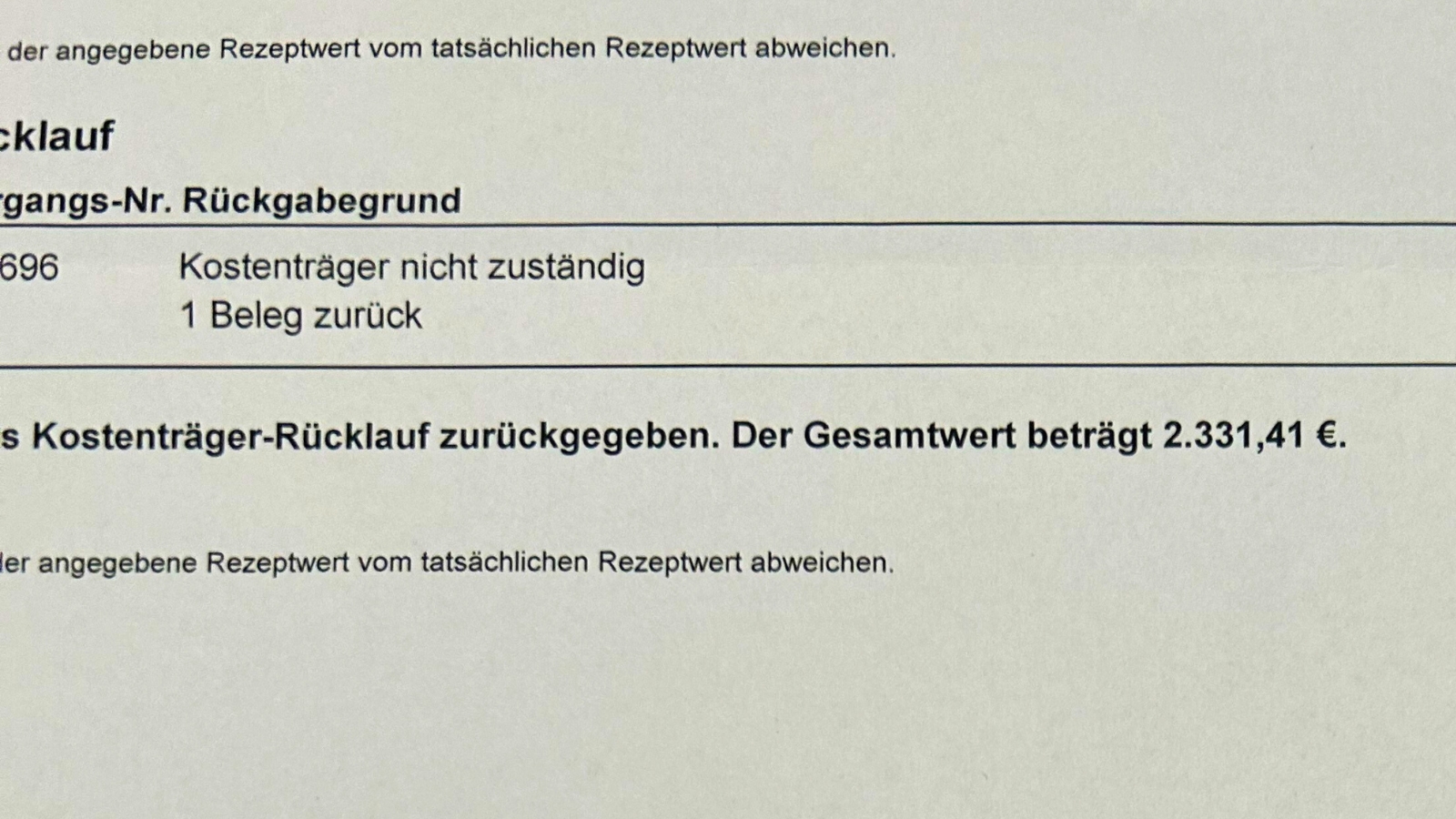 Im Juni 2023 kam das Rezept überraschend vom Rechenzentrum zurück. Die Begründung: Der Kostenträger sei nicht zuständig. Da das Versicherungsverhältnis der Kundin für den Inhaber bei der Belieferung eindeutig gewesen war, wendete er sich verwundert an das zuständige Sozialamt. „Das Rezept müssen Sie bei der neuen Kasse der Versicherten einreichen. Wenn die nicht zahlen, übernehmen wir das“, hieß es von der Mitarbeitenden.