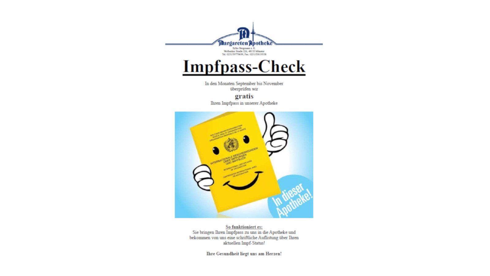 Sie selbst bietet in ihrer Margareten-Apotheke seit fünf Jahren einen Impf-Check an. Dabei werden die Impfausweise der Kunden durchgesehen, der Impfstatus dokumentiert und bei Bedarf an den Arzt verwiesen. „Durch diese Aktion konnten wir viele Impflücken aufdecken“, berichtet Bergmann. Nur ein einziger Ausweis sei vollständig gewesen – ein erschreckendes Ergebnis.