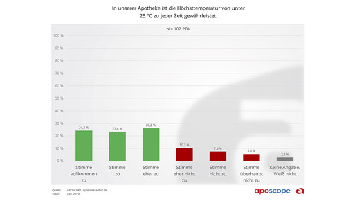 Bei den beiden Betrieben handelt es sich nicht um Einzelfälle: Laut einer APOSCOPE-Umfrage ist es in jeder vierten Apotheke zu heiß. 10,3 Prozent der befragten PTA stimmten der Aussage eher nicht zu, dass die Höchsttemperatur zu jeder Zeit gewährleistet werde. Weitere 7,5 Prozent stimmten nicht zu und 5,6 Prozent stimmten überhaupt nicht zu. In einer von 20 Apotheken ist das Hitzeproblem demnach evident. Laut der Umfrage ist die 25 °C-Vorgabe lediglich in 74 Prozent der Apotheken kein Problem.