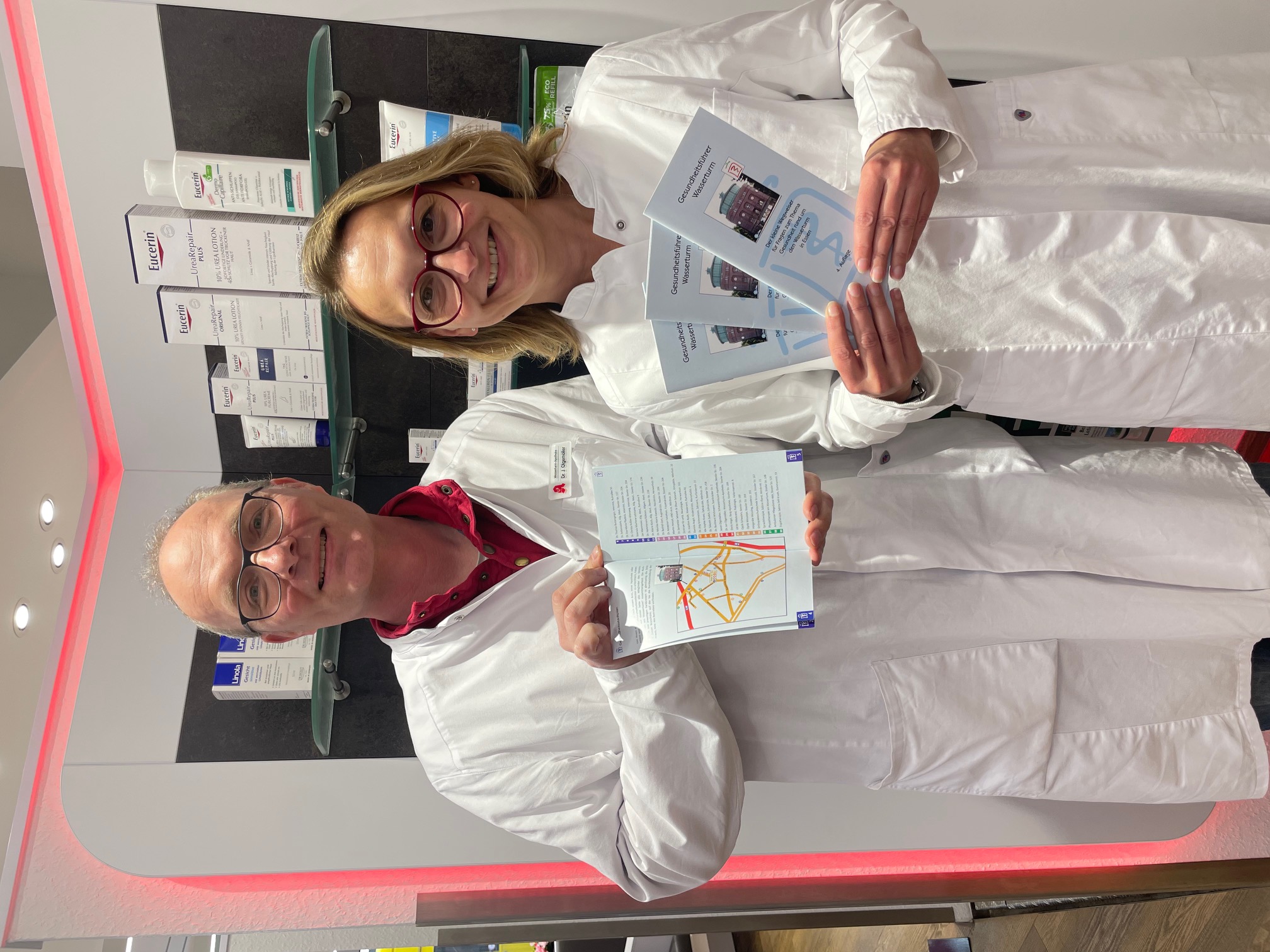 Nur danke es der Apotheke niemand, dass dieses Angebot seit Jahren zum Service gehöre. „Wir haben es sogar übererfüllt und einen ‚Gesundheitsführer‘ veröffentlicht.“ In der erstmals 2007 erschienen Broschüre listen sie für Essen alle Arzt- und Physio- sowie Rehapraxen auf. In der Broschüre stelle sich jeder Betrieb thematisch vor. Das Heft sei für die Kundschaft kostenlos und bereits in der fünften Auflage erschienen. Etwa alle drei Jahre aktualisiert Olgemöller die Inhalte.