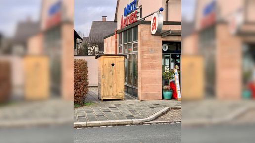 Wer heute zur Nürnberger Moritz-Apotheke kommt, den erwartet ein ungewohnter Anblick: Vor der Offizin steht ein waschechtes Toilettenhäuschen aus Holz, stilecht mit einem eingesägten Herz in der Tür. Die Apotheke von Inhaberin Margit Schlenk bietet ihren Kunden aber kein Pop-up-Notdurftrefugium, sondern kostenlose FFP2-Masken: „Ich stehe da morgen mit Heißlüfter und Kaffeetasse drin und werde die Maskenverteilung rocken“, sagt Schlenk und ist selbst amüsiert über die Aktion. „Wir haben halt nichts anderes. Das wird morgen aufgeklappt, an die Wände kommen Plakate mit den Regularien, davor ein Stehtisch und die Kisten mit den Masken.“ Ursprünglich hatte sie den Donnerbalken vor elf Jahren für eine Aktion zum Thema Inkontinenzversorgung beschafft, seitdem war er eingelagert und wartete darauf, von Schlenks Ehemann in ein kleines Jagdhäuschen umfunktioniert zu werden. Nun wurde er doch nochmal nützlich. „Ich hoffe auf einen großen Ansturm morgen“, sagt Schlenk. „Und ich sage bewusst hoffentlich, weil ich mir wünsche, dass die Menschen gut für das Weihnachtsfest ausgestattet werden.“