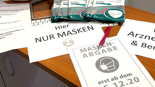 Dass die Aktion trotz der noch nicht veröffentlichten Verordnung noch scheitern könnte, glaubt sie nicht. Also hat sie das Risiko getragen, genügend Masken zu kaufen, und die Apotheke für den erwarteten Ansturm gewappnet. Dazu hat sie, getrennt von den restlichen Kassen, einen eigenen Schalter eingerichtet, an dem unkompliziert und schnell abgegeben werden kann. Für Dienstag hat sie zwei Mitarbeiter ausschließlich für die Masken-Aktion eingeteilt. Denn auch sie rechnet mit einem großen Ansturm: „Das sprengt uns das Normalgeschäft. Wir haben ohnehin gerade schon mehr als sonst und jetzt gehen bundesweit 27 Millionen Menschen los, die kostenlose Maske wollen. Das sind 27 Millionen zusätzliche Kontakte. Wir werden streng darauf achten, dass wir die Hygieneregeln da richtig einhalten, denn es sind ja alles Risikopatienten.“