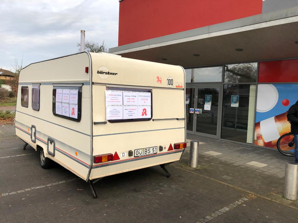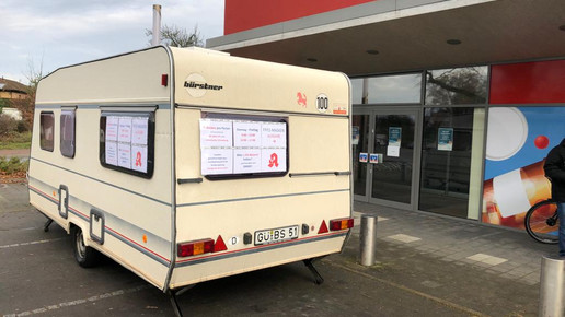 Auch ein kurioser Anblick ist die Apotheke von Inhaber Martin Halm: Er hat auf dem Parkplatz vor seiner Burg-Apotheke im mecklenburgischen Warin einen Wohnwagen stehen. Aus dem heraus sollen morgen die Masken verteilt werden. Er will die Leute nicht in der Apotheke haben, da sei vor Weihnachten genug zu tun. Auch sei diese Lösung mit Blick auf das Infektionsgeschehen besser. Fahrer und Reinigungskraft aus dem Team teilen sich die Schichten im Wohnwagen ein und versorgen die Kunden über die „Pferdetür“, die sich als Fenster halb öffnen lässt. Ein Heizkörper wurde schon reingeschafft, eben holt Halm noch eine Plexiglasscheibe aus dem Baumarkt. Lichterkette, fertig. Morgen Nachmittag erwartet er eine größere Lieferung mit 4000 Masken, bis dahin müssen die letzten 1000 Masken aus dem aktuellen Bestand reichen.