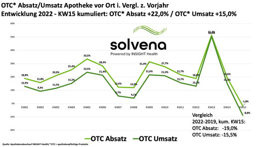 - Noch deutlicher ist der Effekt bei den OTC-Abverkäufen: Umsatz und Absatz lagen in KW 13 sogar 50 beziehungsweise 51 Prozent über Vorjahr. Auch in der darauffolgenden Woche, in die im vergangenen Jahr der Ostermontag fiel, lagen die Werte 15 und 20 Prozent höher. In KW 15, also der Karwoche in diesem Jahr, lagen der Umsatz 9 Prozent und der Absatz 2 Prozent unter Vorjahr. Kumuliert ist der Markt 15 beziehungsweise 22 Prozent im Plus. Gegenüber 2019 steht allerdings ein Minus von 16 beziehungsweise 19 Prozent.