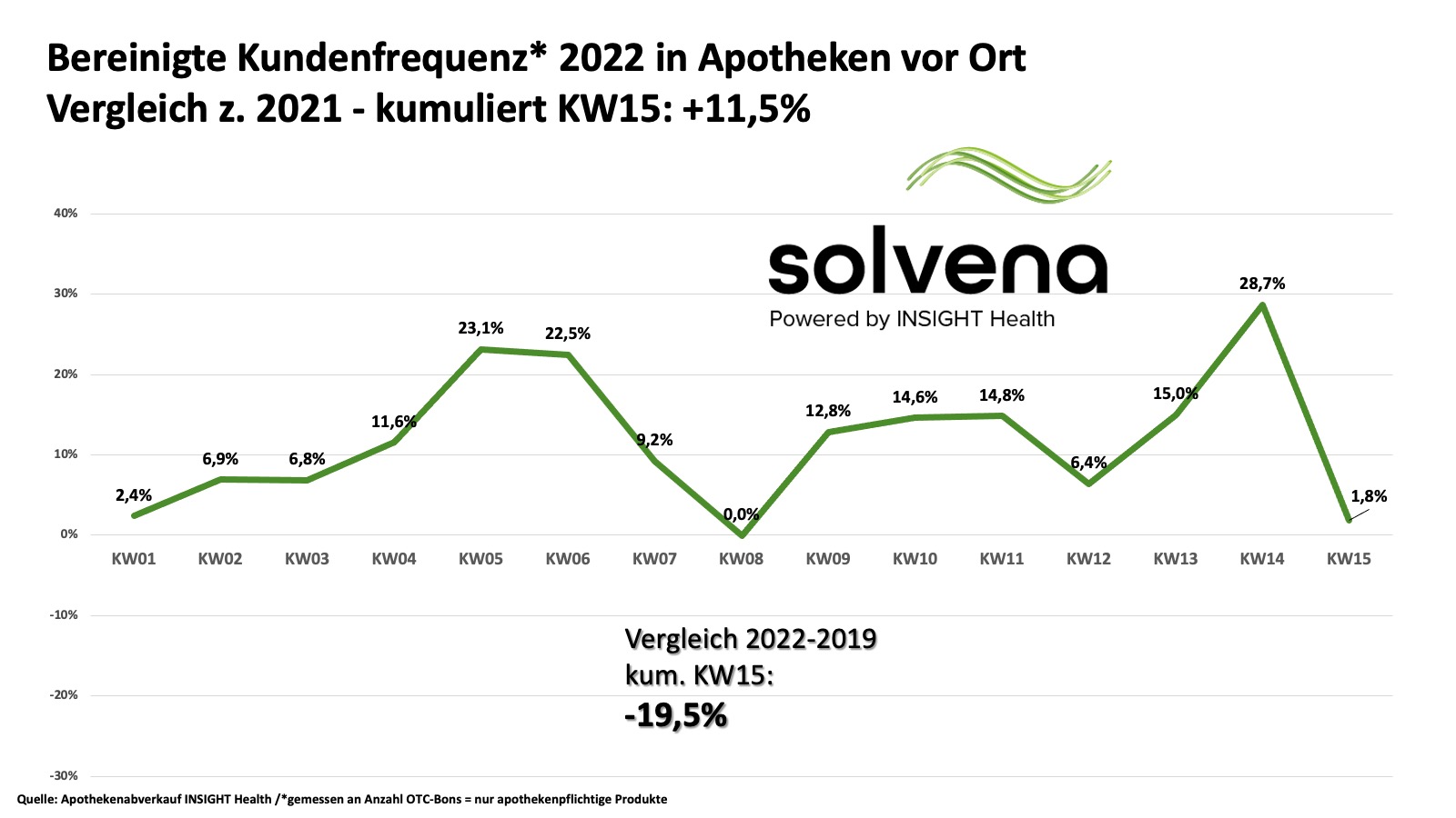 - Die Kundenfrequenz lag in KW 13 um 15 Prozent und in KW sogar um knapp 29 Prozent über Vorjahr. In KW 15 liegt sie immerhin noch 2 Prozent darüber, auch KW 16 wird entsprechend wohl schwach ausfallen. Kumuliert liegt 2022 bislang 11,5 Prozent über Vorjahr.