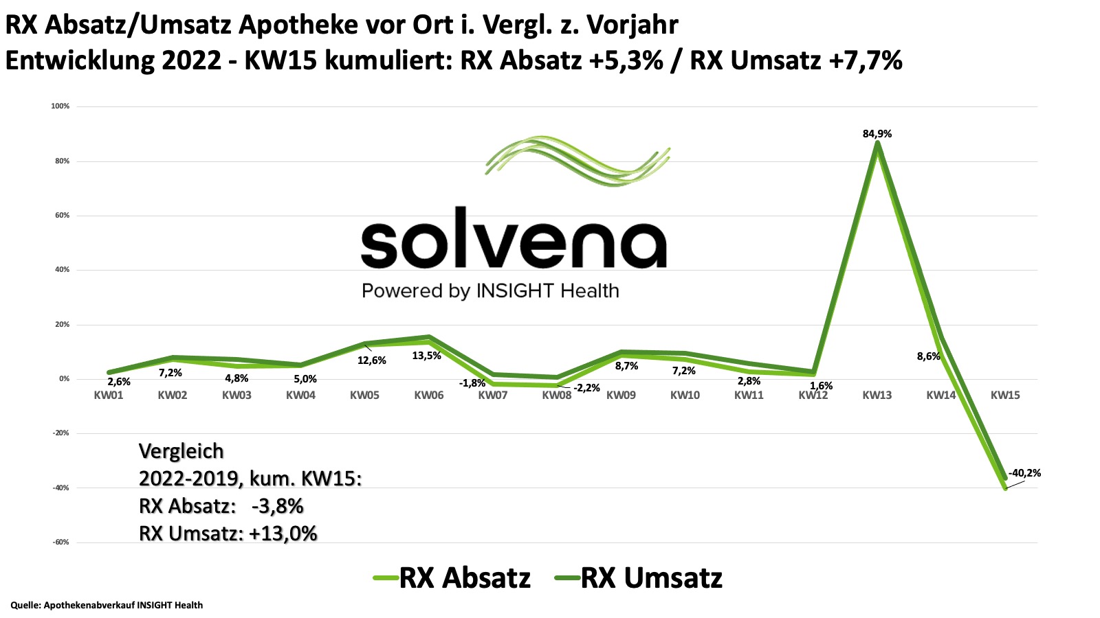 - Gerade herausstechend ist der Effekt im Rx-Bereich: Weil hier auch noch der Quartalswechsel wohl eine Rolle spielt, lagen Absatz und Umsatz in KW 13 um sagenhafte 89 Prozent über Vorjahr. In KW 14 stand immerhin noch ein Plus von 9 Prozent. Umso dramatischer der Einbruch in der Vorosterwoche, die 40 Prozent unter Vorjahr liegt. Auch hier sind Umsatz und Absatz mit 8 beziehungsweise 5 Prozent im bisherigen Jahresverlauf im Plus. Gegenüber 2019 wurden zwar 4 Prozent weniger Packungen abgegeben, aber der Umsatz wuchs um 13 Prozent.