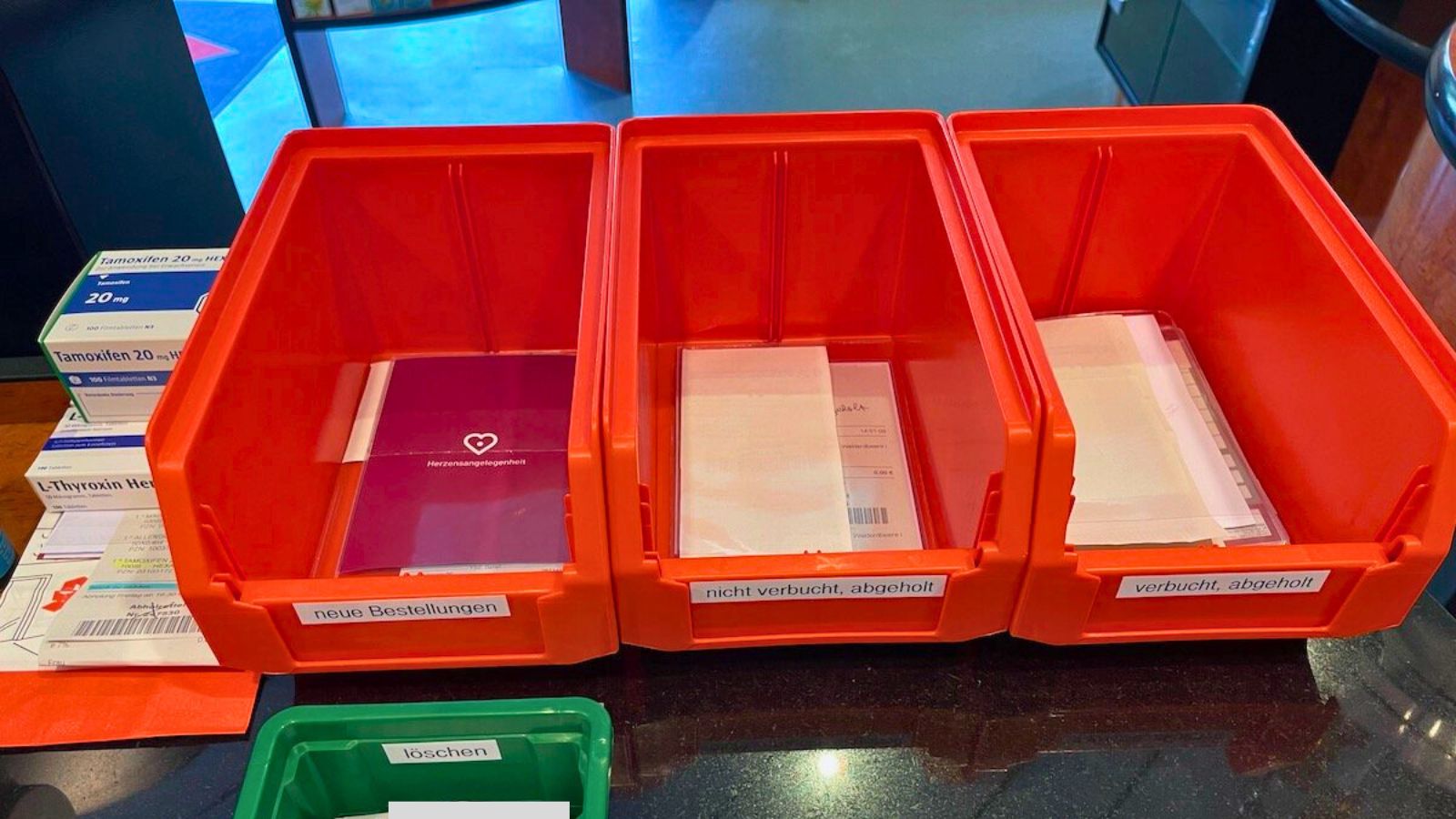Da sie auch nicht bei Phoenix bestellen könne, hat sie sich ein System überlegt: Als Notlösung hat die Inhaberin drei rote Kästchen aufgestellt. In dem einen landeten verbuchte und abgeholte Bestellungen. In einem weiteren würden nicht verbuchte, aber abgeholte abgelegt und im dritten würden QR-Code-Schnipsel oder -Kopien gesammelt. Doch bei digitalen E-Rezepten muss sie passen. „Ich schicke die Kunden dann zum Kollegen“, sagt sie. Man müsse der Kundschaft eine Lösung eröffnen.