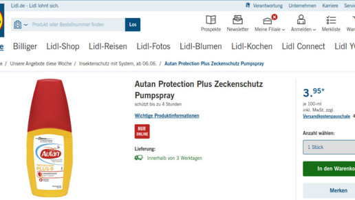 Seit Dienstag steht Autan zum Dumpingpreis in den Regalen des Discounters. Auf Seite 12 des aktuellen Prospekts wird das Spray zwischen Fliegengittern und Ameisenspray beworben – zu einem Preis, bei dem Apotheken nicht mithalten können. Großhändler bieten einen regulären AEP von 7,02 Euro. Apotheken, die zum Sonderpreis direkt beim Hersteller einkaufen, zahlen etwa 4,95 Euro. Lidl kann das Produkt für 3,95 Euro verramschen; nur online lohnt sich der Kauf wegen der Versandkosten von 4,95 Euro nicht. Ohnehin ist das Spray derzeit im Webshop nicht mehr zu haben.