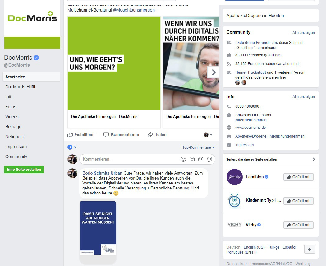 „Der Versandhandel ist auf dem Vormarsch, im Zuge der allgemeinen Digitalisierung hat er ein gewisses Wachstumspotenzial“, sagt Schmitz-Urban. Vor einiger Zeit habe DocMorris mit dem Slogan „Und, wie geht‘s uns morgen?“ geworben. „Doch warum überhaupt bis morgen warten, fiel mir dazu ein. Wenn es mir heute schlecht geht, will ich es auch heute behandelt haben.“