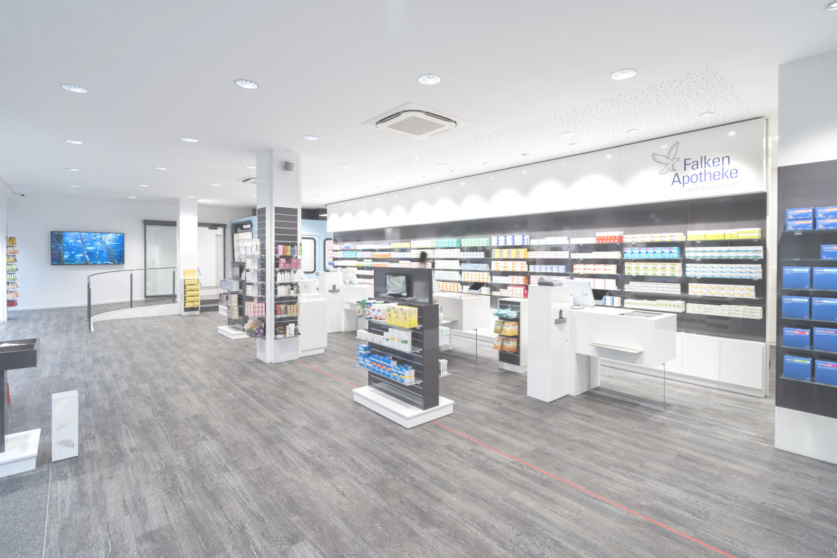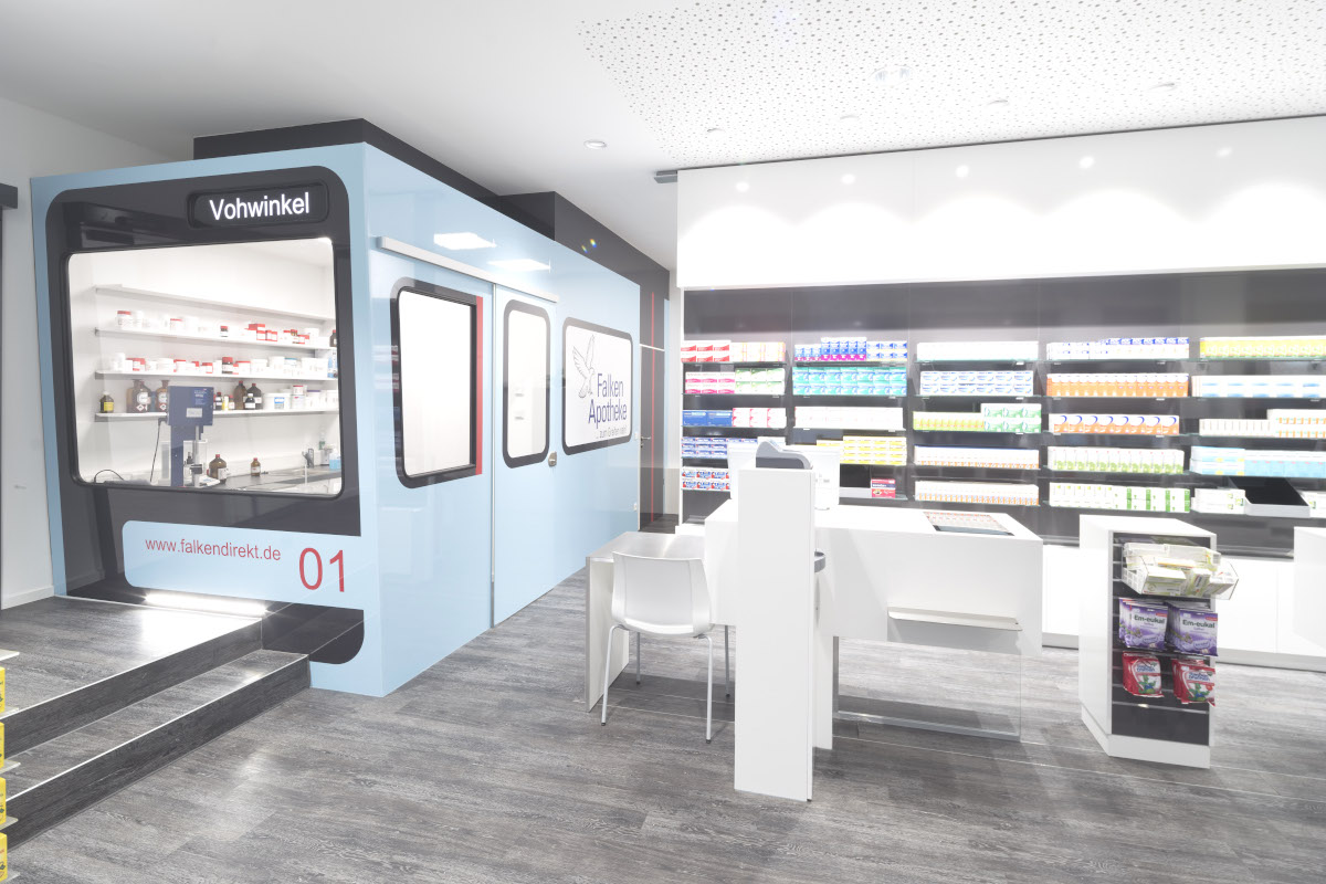 Er selbst studierte neben Pharmazie auch Marketing-Kommunikation und Management in Düsseldorf. Vor fünf Jahren machte er sich mit der ersten Falken-Apotheke in Wuppertal selbstständig, 2016 folgte die zweite. Etwa eine Million Euro habe er pro Betrieb investiert. „Die zweite Apotheke lief von Anfang an super, die Kundenresonanz ist nachhaltig.“ Beide Betriebe hätten einen hohen Wiedererkennungswert, meint Schmitz-Urban. „Sie sind transparent gehalten. Im HV-Bereich will ich jede Reizüberflutung bewusst vermeiden, in der Freiwahl gibt es kaum Ware, 80 bis 90 Prozent werden digital über Touchscreens präsentiert.“ Das unterscheide ihn von 90 Prozent der Mitbewerber. „Die Rezeptur im Design der Wuppertaler Schwebebahn steht in der Offizin, so entsteht ein direkter Bezug zur Stadt und wir zeigen transparent, was wir machen.“ Ein Online-Shop mit regionalem Versand, dazu ein ganztägiger Lieferservice und Abholfächer komplettierten das Angebot.