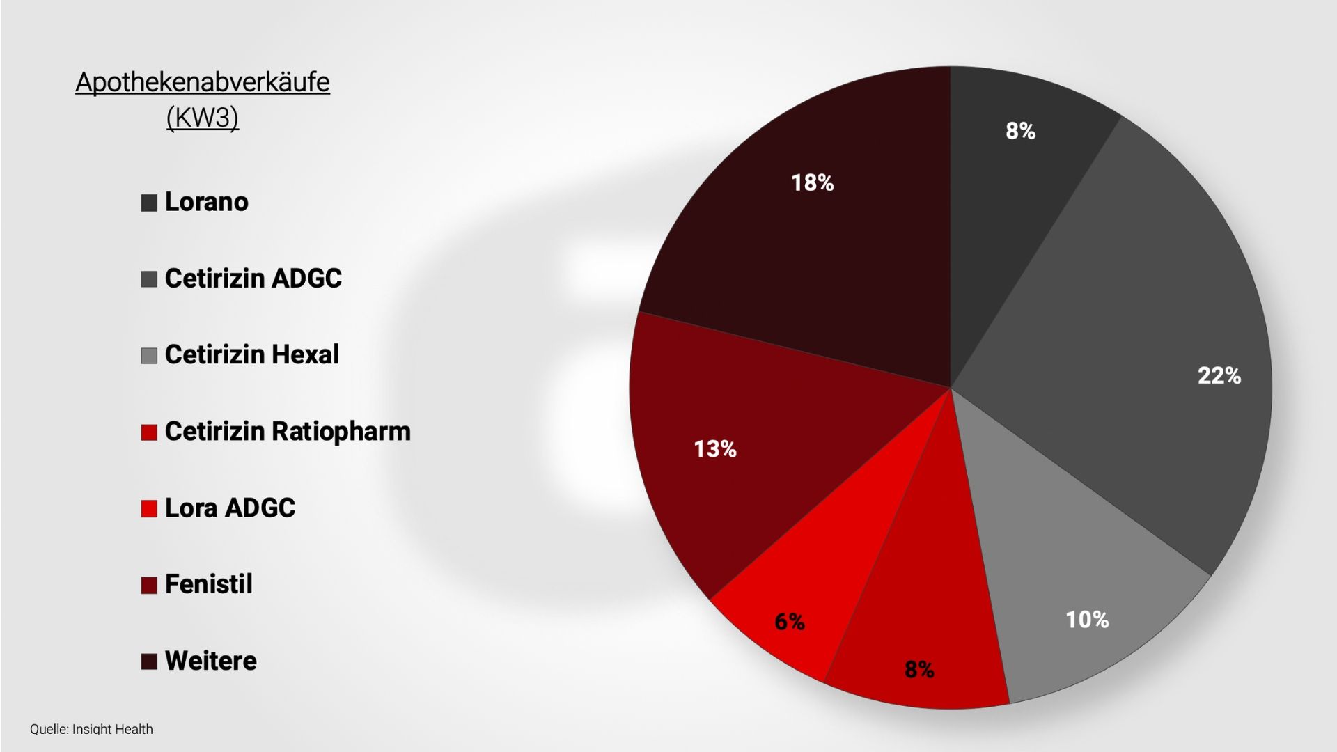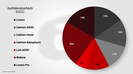In KW 11 (9. bis 15. März) taucht LoranoPro erstmals in der wöchentlichen Abverkaufsstatistik von Insight Health auf; in KW 22 (25. bis 31. Mai) hatte sich der Newcomer an die Spitze des Marktes gesetzt: Mit einem Anteil von 14,2 Prozent nach verkauften Packungen liegt LoranoPro vor dem Schwesterprodukt Lorano, das – überraschenderweise – ebenfalls deutlich von 7,6 auf 13,3 Prozent zulegen konnte. Zusammen mit Cetirizin und dem im vergangenen Jahr eingeführten Levocetirizin kommt der Konzern auf einen Marktanteil von 43 Prozent. Zum Vergleich: Zu Beginn der Saison hatte der Marktanteil noch unter 20 Prozent gelegen.