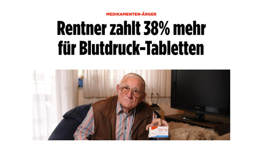 Wenn Hoffmann in der Apotheke zum Geldbeutel greife, dann „packt ihn die Wut“ schreibt Bild. „Um 38 Prozent hat sich für mich als Patient der Preis erhöht: Statt 59,01 zahle ich neuerdings 81,81 Euro zu – Wahnsinn.“