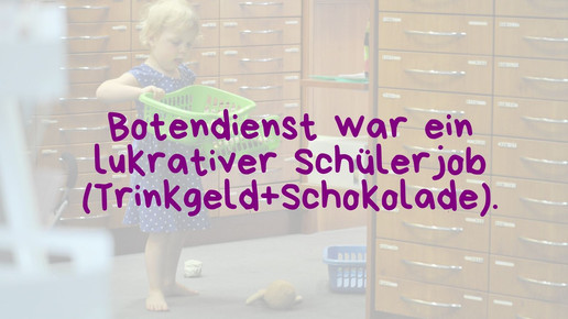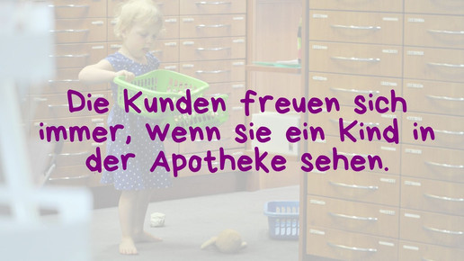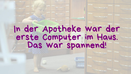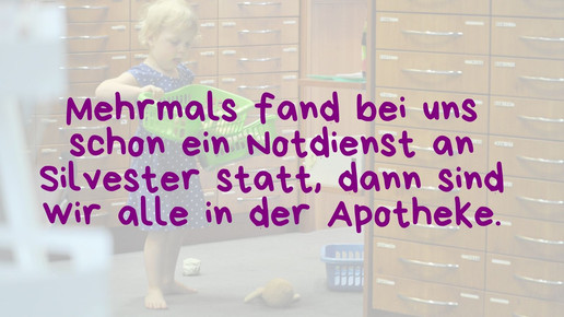 Und wenn es doch zu langweilig zu Hause wird, schaut man in der Apotheke vorbei. Manche Mitarbeiter sind schon im Betrieb, solange ich denken kann. Schon früh durfte ich außerdem in der Apotheke helfen und einfache Arbeiten übernehmen: Aufkleber auf Taschentücher kleben oder Zeitungen abstempeln. In den Ferien nahm mich meine Mutter manchmal mit in die Apotheke, damit ich aushelfen konnte.