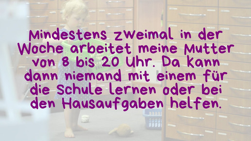 Zu den Nachteilen: Da sind zunächst die Arbeitszeiten: Mindestens zweimal in der Woche arbeitet meine Mutter von 8 bis 20 Uhr und ist somit manchmal erst spätabends zu Hause. Da kann dann niemand mit einem für die Schule lernen oder bei den Hausaufgaben helfen, weil auch mein Vater lang arbeiten muss. Andererseits ist es schön, wenn man allein zu Hause ist – keiner nervt oder will irgendwas.