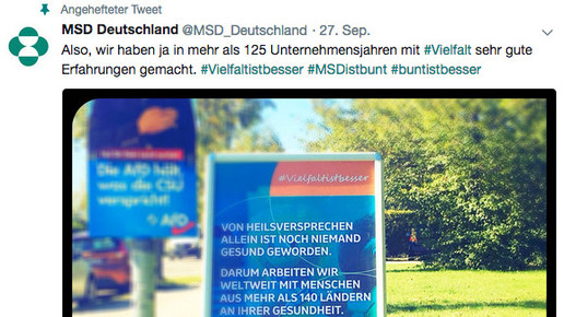 Das Wahlplakat war laut Habereder der Auslöser für die spontane Aktion. Die Haltung von MSD zur Vielfalt werde jedoch nicht an einer Partei festgemacht. „Uns geht es darum zu zeigen, dass MSD das Thema Vielfalt hoch auf der Agenda hat. MSD ist bunt. Vielfalt ist besser, das ist unsere Erfahrung.“ Zuspruch erhält MSD auch von Mitarbeitern: „Danke Kollegen. Deshalb mag ich es, hier zu arbeiten.“