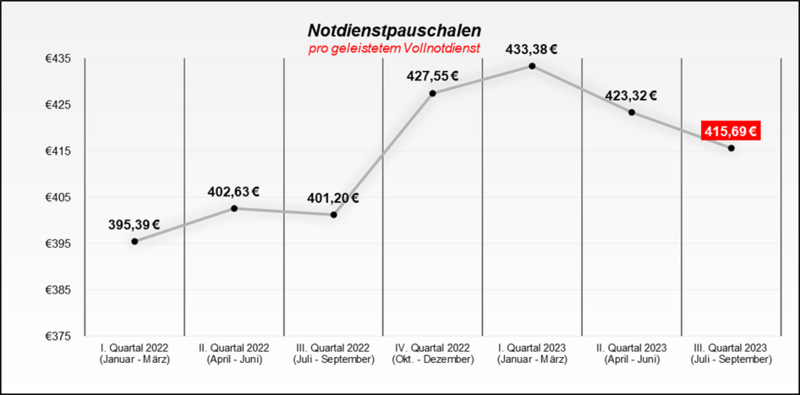 Die Notdienstpauschale ist im dritten Quartal im Vergleich zum Vorquartal leicht gesunken. Der Nacht- und Notdienstfonds (NNF) teilt mit, dass für jeden geleisteten Vollnotdienst 415,69 Euro ausgezahlt werden. Im ersten Quartal waren es 433,83 Euro, im zweiten Quartal noch 423,32 Euro. Dabei wurden in dritten Quartal insgesamt die meisten Notdienste geleistet. Immerhin: Die Verwaltungskosten fallen diesmal äußerst gering aus.