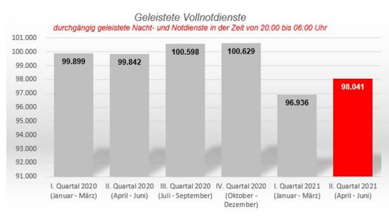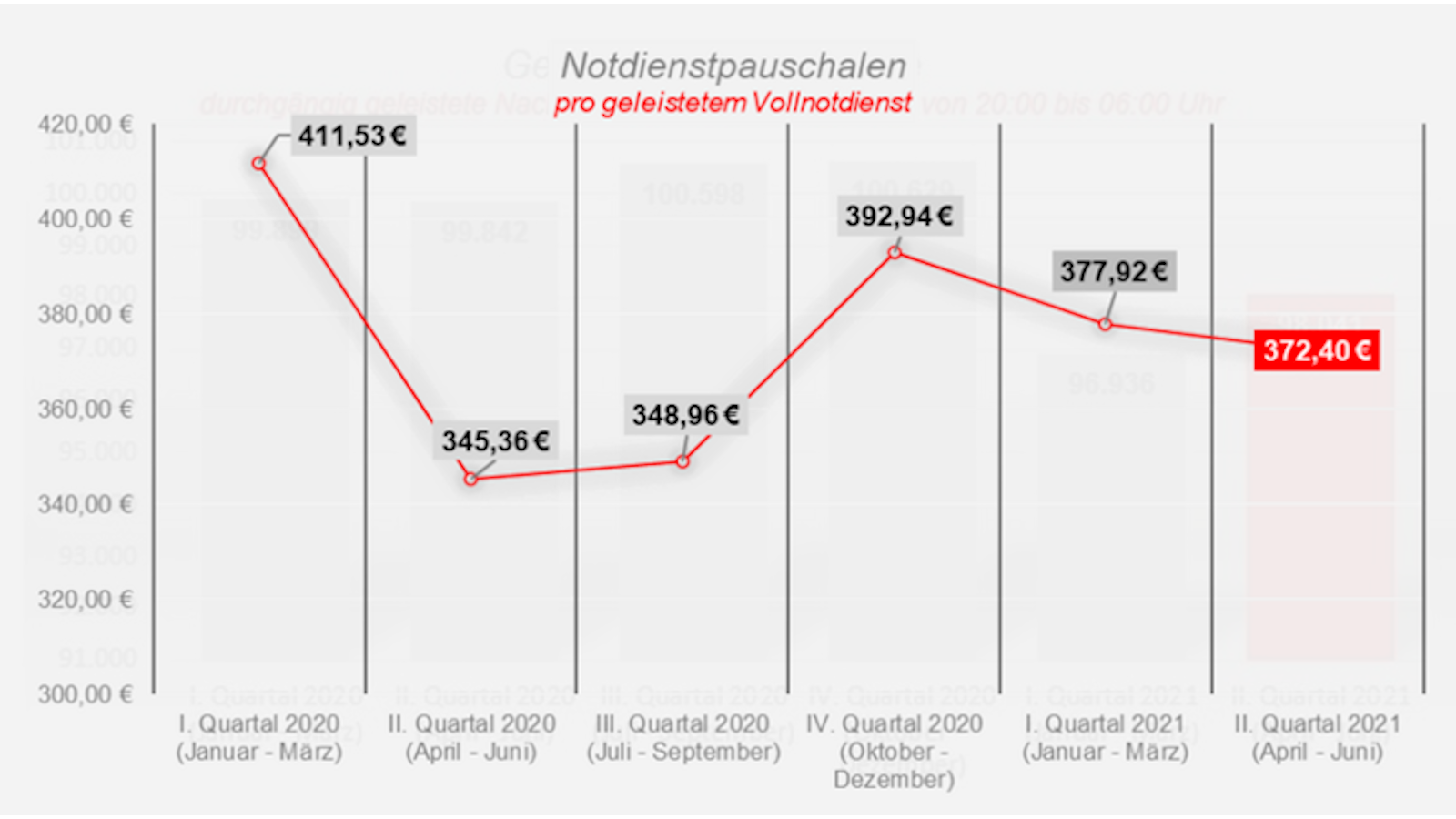 Geteilt durch die Anzahl der Notdienste ergibt sich ein pauschaler Zuschuss in Höhe von 372,40 Euro nach 377,92 Euro im ersten Quartal (minus 1,46 Prozent) und 345,36 Euro im zweiten Quartal des Vorjahres.