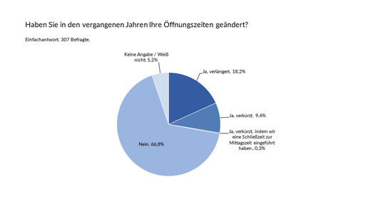 Zwar geht der Trend auch in Apotheken insgesamt in Richtung längerer Öffnungszeiten, allerdings sehr zurückhaltend – und teilweise sogar mit gegenläufiger Bewegung. Zwei Drittel der Befragten gaben an, dass die Öffnungszeiten sich in ihrer Apotheke in den vergangenen Jahren überhaupt nicht verändert haben. Länger geöffnet haben 18,2 Prozent der Apotheken. Auf der anderen Seite haben auch 9,4 Prozent der Apotheken ihre Öffnungszeiten verkürzt. Interessant: In Center-Apotheken überwiegt der Anteil mit neuerdings kürzeren Öffnungszeiten.