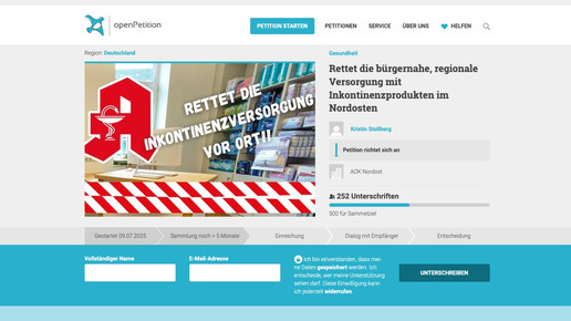 Ohne ein Einlenken sei eine niedrigschwellige, regionale und zeitnahe Versorgung bei Inkontinenzprodukten nicht zu sichern. „Es muss Schluss sein mit der Benachteiligung von alten Menschen, Menschen mit Behinderung und pflegebedürftigen Menschen.“ Eine stärkere Ausrichtung auf große Versand- und Wirtschaftsunternehmen bringe für Patient:innen keinerlei Vorteile, schreibt die Inhaberin. „Und sie schadet den regionalen, inhabergeführten Apotheken, die seit Jahren gute Arbeit mit ihren Patient:innen geleistet haben.“