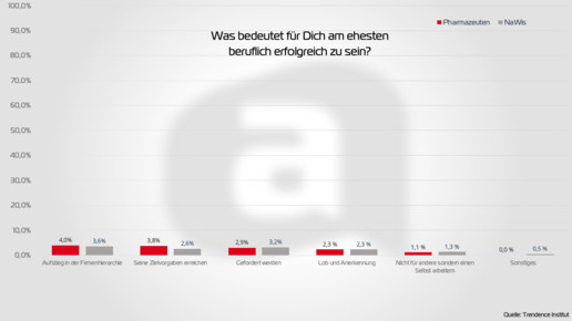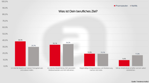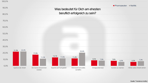 Pharmazeuten definieren ihren beruflichen Erfolg der Erhebung zufolge sehr viel häufiger über ein hohes Einkommen als andere Naturwissenschaftler. Gleichzeitig ist etwas Sinnvolles zu erschaffen für sie sehr viel seltener ein Indikator für Erfolg. Für alle ist der Spaß an der Arbeit Erfolgsfaktor Nummer 1. Ein weiteres wichtiges berufliches Ziel der Pharmaziestudenten ist, Experte im Fachgebiet zu sein. „Damit unterscheiden sie sich von anderen Naturwissenschaftlern, für die Abwechslung und Weiterentwicklung das berufliche Ziel sind“, so die Sprecherin.