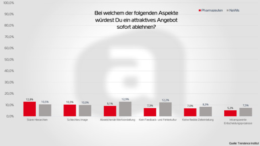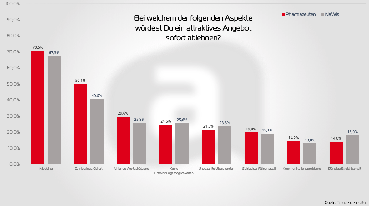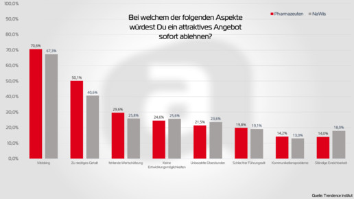 Hinderungsgrund Nummer 1 für ein sonst attraktives Arbeitsangebot ist für alle Befragten Mobbing im Job. Wenn das Gehalt aber zu niedrig ist, lehnt die Hälfte der befragten Pharmaziestudenten ein ansonsten attraktives Arbeitsangebot ebenfalls ab. Andere Naturwissenschaftler sehen das nicht so eng: Hier würden nur knapp 41 Prozent ein Jobangebot wegen eines zu niedrigen Gehalts ablehnen. Weniger Kompromisse machen angehende Apotheker im Gegensatz zu anderen Studenten, wenn es darum geht, ständig erreichbar sein zu müssen.