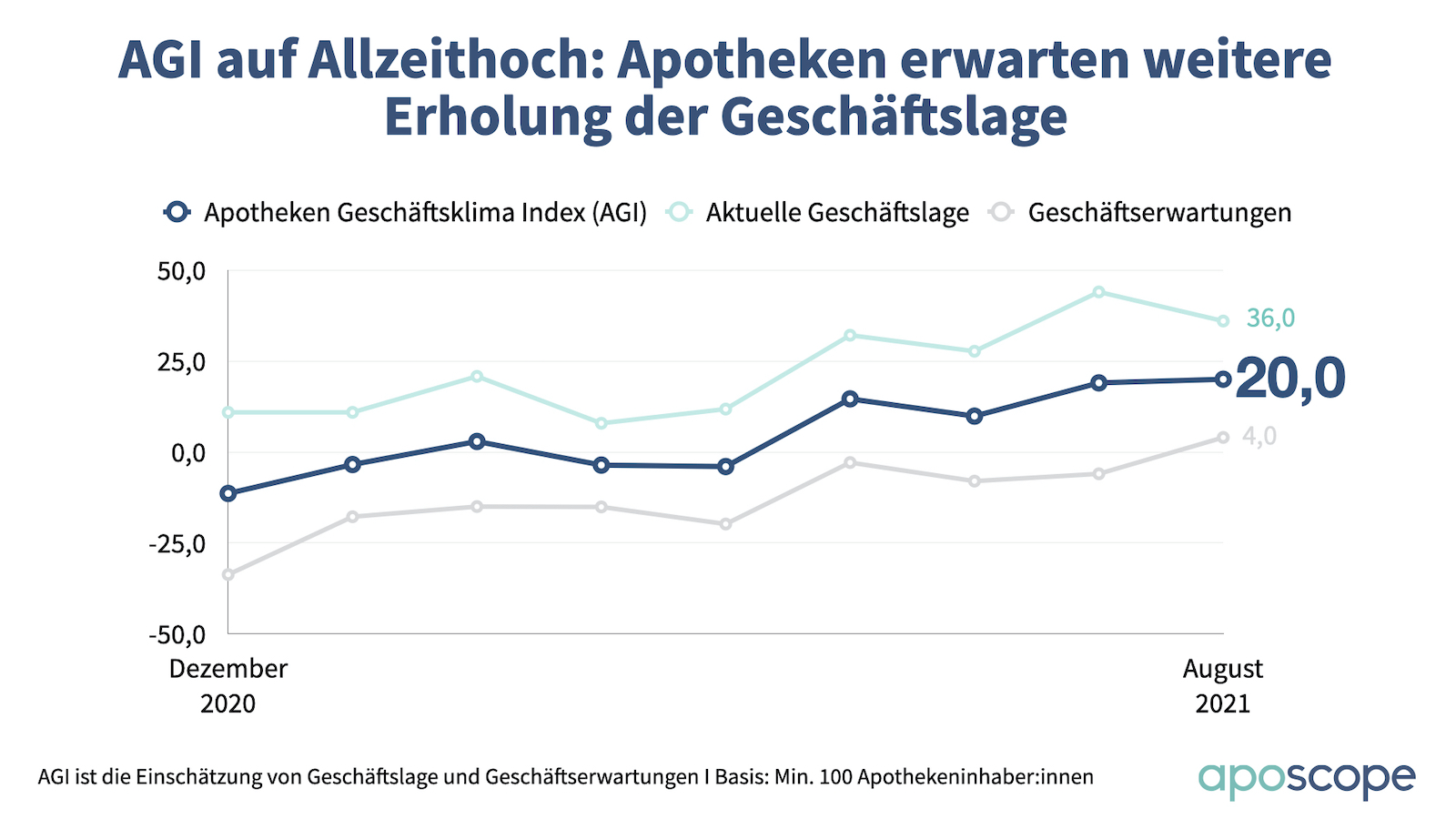 Insgesamt konnte sich der Apotheken Geschäftsklima Index (AGI), der sich aus der Einschätzung von Geschäftslage und Geschäftserwartung berechnet, weiter erholen. Er notiert nun bei einem Allzeithoch von 20,0 Punkten und schreibt damit den positiven Trend der letzten Monate fort.
