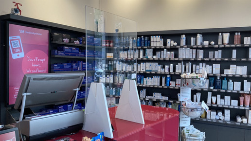 Zu Beginn der Pandemie hat der Handel schnell Schutzmaßnahmen umgesetzt – vielerorts wurden Plexiglasscheiben aufgestellt. Auch in Apotheken gehören die durchsichtigen Trennwände am HV-Tisch fast schon zum Alltag. In einer Berliner MediosApotheke soll die provisorische Plexiglasscheibe jetzt fest installiert werden.