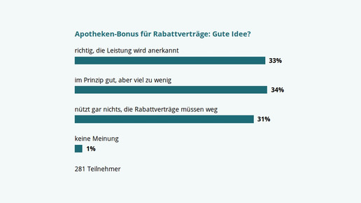 31 Prozent der Teilnehmer können mit der Extra-Honorierung nichts anfangen. Sie fordern, dass Rabattverträge generell abgeschafft werden sollten. 1 Prozent hatte dazu keine Meinung.