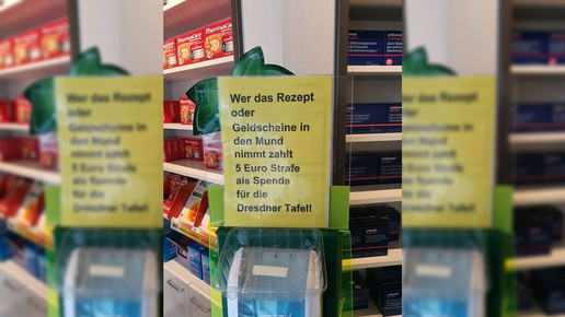 Um die Ausbreitung des Coronavirus zu hemmen, gelten auch in Apotheken viele neue Regeln. Markierungen auf dem Boden halten die Kunden auf Distanz, manchmal gibt es getrennte Ein- und Ausgänge und Handdesinfektion ist Pflicht. Doch nicht immer werden die Vorschriften beachtet. Die Teams in den Apotheken versuchen mit verschiedenen Mitteln, auf ihre Kundschaft einzuwirken – manchmal auch mit einer Zwangsspende.