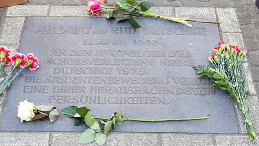 „Normalerweise ist hier nicht viel los“, sagt Kraatz, die von ihrem Büro im ersten Stock über der Apotheke auf den Gedenkort blicken kann. Aber heute gedenkt man des Mannes, der hier niedergeschossen wurde. Der Attentäter Josef Bachmann soll „Du dreckiges Kommunistenschwein!“ gerufen haben, bevor er den Abzug betätigte. Der Täter beging 1970 in Haft Suizid.