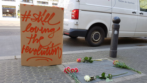 Apothekerin Sandra Kraatz sagt: „Menschen haben heute vor der Apotheke Blumen niedergelegt.“ Und ein selbst gebasteltes Papp-Plakat mit der Aufschrift #stilllovingtherevolution“ aufgestellt. Die Waage-Apotheke wurde im Jahr 1973 eröffnet, davor befand sich auf dieser Höhe des Kurfürstendamms ebenfalls eine Apotheke.