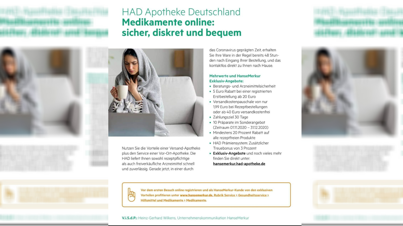 „Nutzen Sie die Vorteile einer Versandapotheke plus die Vorteile einer Vor-Ort-Apotheke“, heißt es im aktuellen Werbeflyer der Hanse Merkur. Die HAD liefere sowohl OTC- als auch Rx-Arzneimittel schnell und zuverlässig: „Gerade jetzt in einer durch das Coronavirus geprägten Zeit erhalten Sie die Ware in der Regel bereits 48 Stunden nach Eingang ihrer Bestellung und das kontaktlos direkt zu ihnen nach Hause.“ Soweit so unproblematisch.