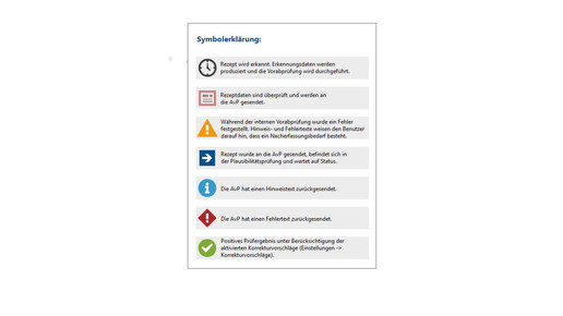 Nach der Rückmeldung vom Rechenzentrum erkennt der Apotheker anhand bestimmter Symbole und Farben, wie es um die Belieferung der Verordnung bestellt ist. Grün bedeutet alles okay – grünes Licht für Abrechnung. Erscheint ein blaues I, ist eine Aufforderung zur Kontrolle hinterlegt. So wird zum Beispiel bei einer Sonder-PZN an die handschriftliche Dokumentation erinnert. Der Apotheker kann dann bestätigen, an alle Formalitäten beim Bedrucken gedacht zu haben.