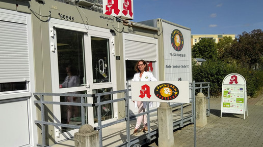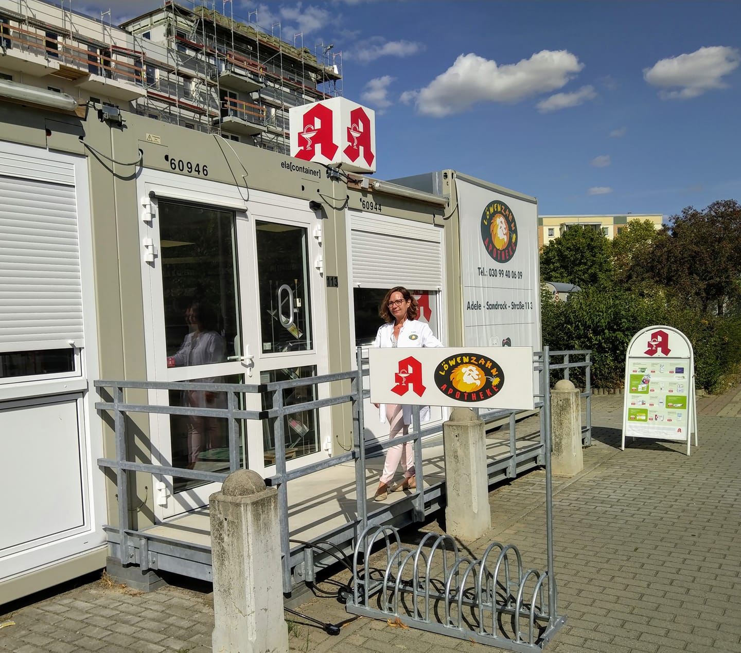 Inhaberin Arend hatte das klassische Glück im Unglück: Das Gebäude, in dem sich ihre Löwenzahn-Apotheke befand, wurde abgerissen. Das kleine Einkaufszentrum für die Nahversorgung – samt Apotheke, Zahnarzt, Bäcker und Zeitungsladen – musste einem Investorenbau weichen. Es ist eine Geschichte, von der tausende Berliner ein Lied singen können. „Wir aber hatten zum Glück einen noch zehn Jahre gültigen Mietvertrag“, erklärt sie. „Deshalb mussten wir wohl oder übel übernommen werden.“ Da das bisherige Gebäude natürlich trotzdem abgerissen wurde, stellten die Bauherren ihr einen Container hin – oder besser: einen Containerkomplex, der ihren Betrieb samt seiner sechs Mitarbeiter beherbergt.