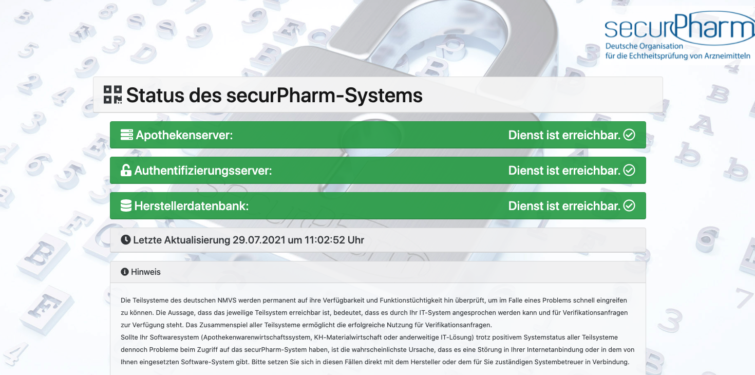 Die meisten Softwareprodukte könnten Anfragen an das Securpharm-System puffern. Das bedeutet, dass die Anfragen gesammelt würden und eine Rückmeldung gegeben werde, sobald das System wieder verfügbar sei. Um zu verhindern, dass es zu gehäuften Fehlalarmen infolge doppelter Ausbuchungsversuche kommt, sollte von wiederholten Ausbuchungsversuchen abgesehen werden.