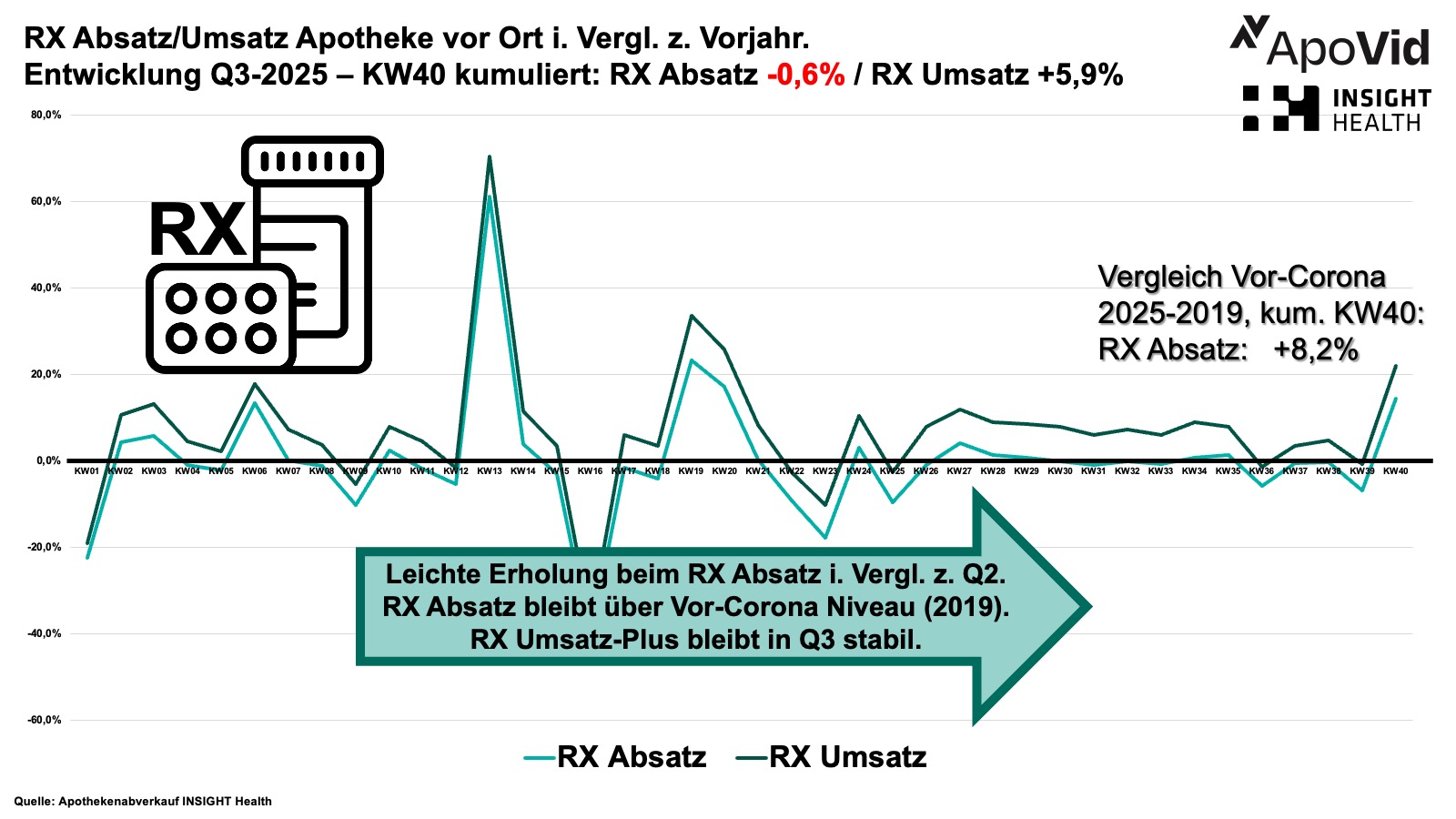 Im Rx-Bereich liegt der Absatz 0,6 Prozent unter Vorjahr, eine leichte Verbesserung gegenüber dem ersten Halbjahr (minus 1,2 Prozent). Der Umsatz liegt 5,9 Prozent über Vorjahr und damit ebenfalls über dem ersten Halbjahr (5,4 Prozent), aber unter dem ersten Quartal (7,4 Prozent). Im Vergleich zu 2019 liegt der Rx-Absatz bei plus 8,2 Prozent.