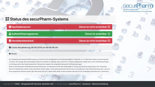 Ursachenforschung und die Suche nach Rat zur Fehlerbehebung gestalteten sich auch schwierig: Anrufer kamen bei Securpharm und der NGDA meist nicht durch, mutmaßlich wegen des hohen Aufkommens waren die Leitungen überlastet. Gegen zehn Uhr am Donnerstagmorgen war die Securpharm-Statusseite erreichbar, zeigte jedoch an, dass sowohl der Apothekenserver als auch die Herstellerdatenbank nicht erreichbar seien. Beide Zeilen waren rot markiert. Der Authentifizierungsserver arbeitet der Seite zufolge jedoch korrekt. Kurz darauf fiel die Seite wieder komplett aus.