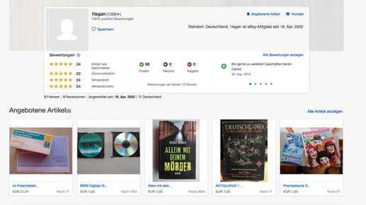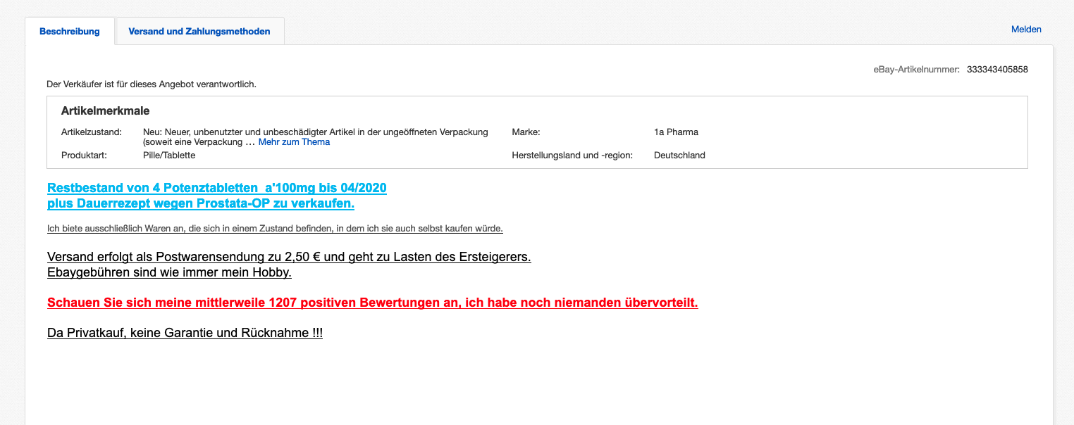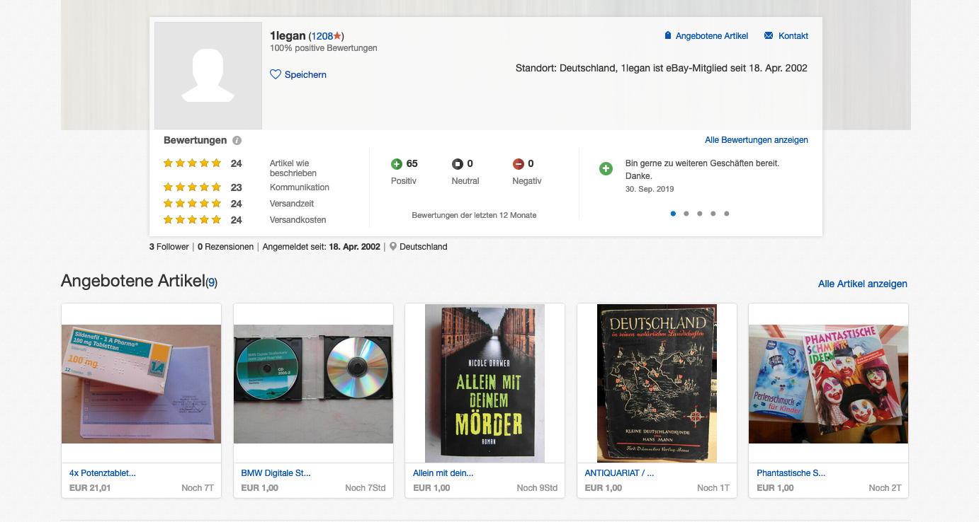 In der Tat sammelte „1legan“ seit seiner Anmeldung im Jahr 2002 ausschließlich sehr gutes Feedback. Jedoch wirken seine übrigen Angebote, wie etwa ein Kriminalroman oder Mathematiklehrbuch, weit weniger gesetzeswidrig als die Auktion für verschreibungspflichtige Medikamente. Dem Nutzer wurde sogar ein Ebay das Vertrauenssiegel „geprüftes Mitglied“ verliehen.