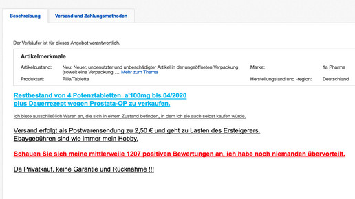 Noch abenteuerlicher ist, was der Händler außerdem anbietet: Neben dem Medikament sichert sich der Käufer in spe ein Dauerrezept. Dies wurde in der Facharztpraxis für Urologie von Markus Roder ausgestellt – wegen einer Prostata-OP, wie „1legan“ angibt. Der Verkäufer sieht an seiner Auktion nichts Unrechtes. „Schauen Sie sich meine mittlerweile 1207 positiven Bewertungen an“, verweist er auf seinen guten Ruf in der Ebay-Gemeinde.