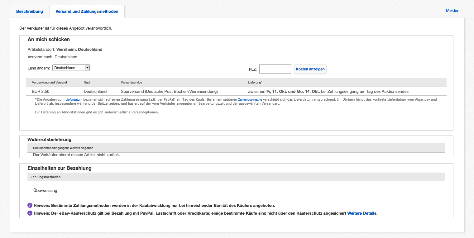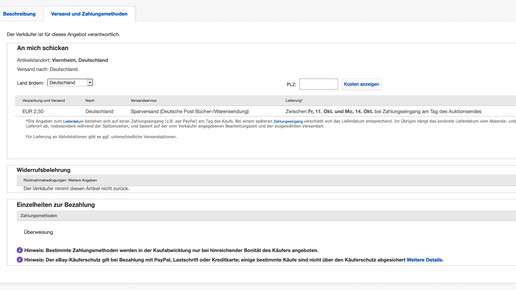 Auch in der Produktbeschreibung wirbt „1legan“ um Vertrauen in seine Auktionen. „Ich biete ausschließlich Waren an, die sich in einem Zustand befinden, in dem ich sie auch selbst kaufen würde“, schreibt der Händler. Generös teilt der Nutzer mit, dass er die Ebay-Gebühren übernimmt. Lediglich die Versandkosten von 2,50 Euro müsse der Ersteigernde selbst tragen.